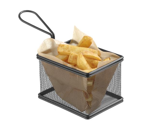 Koszyk miniaturowy do smażonych przekąsek wykończony czarnym, matowym pokryciem.