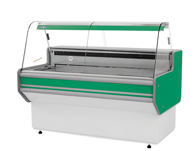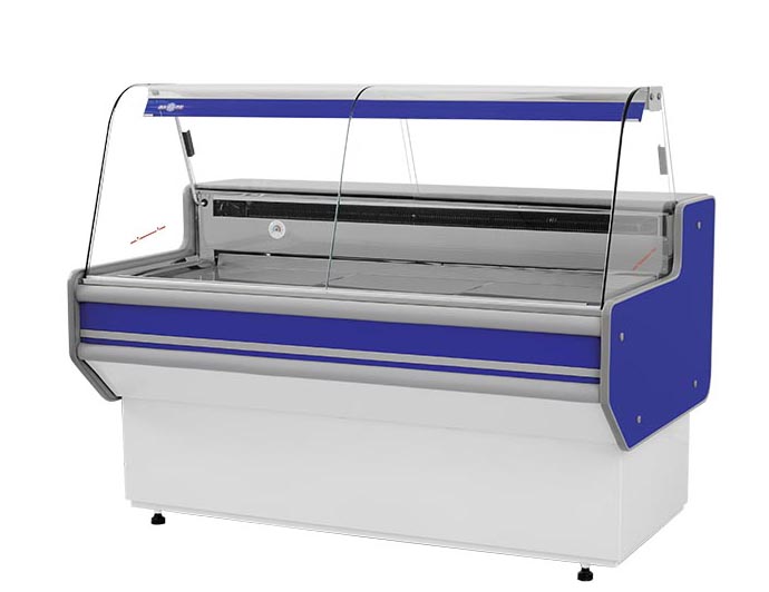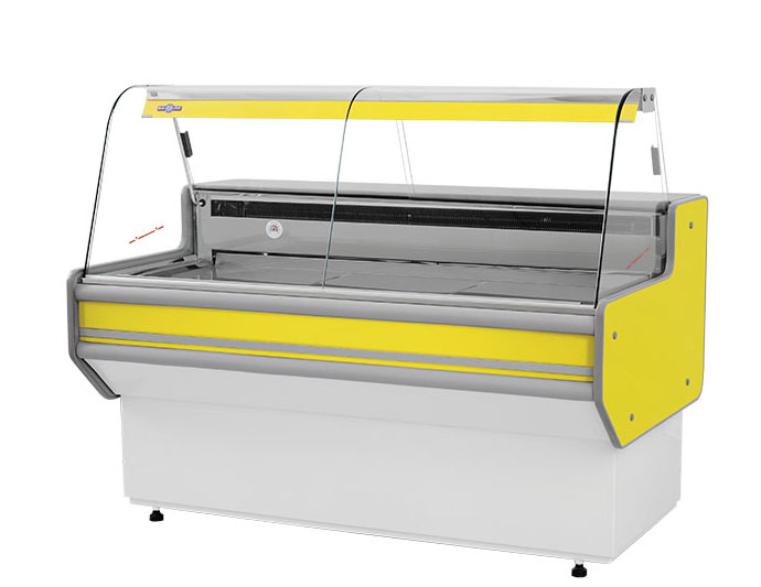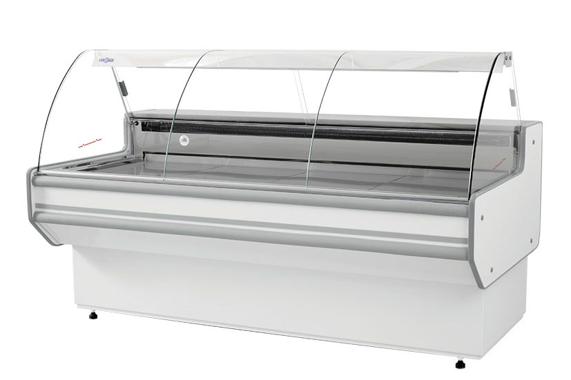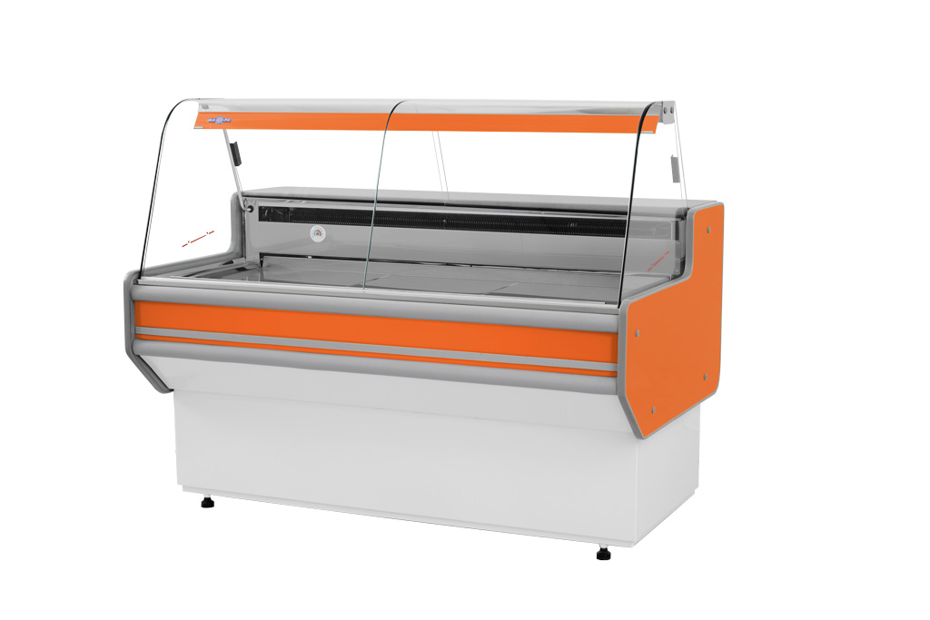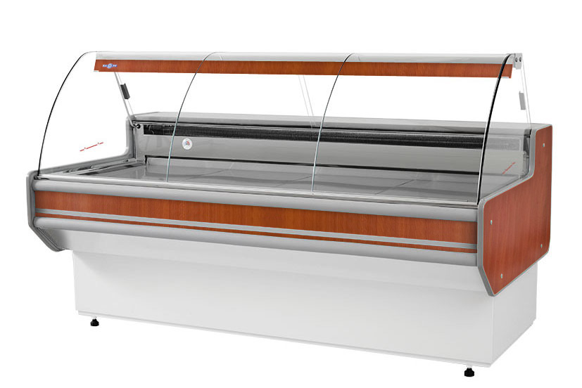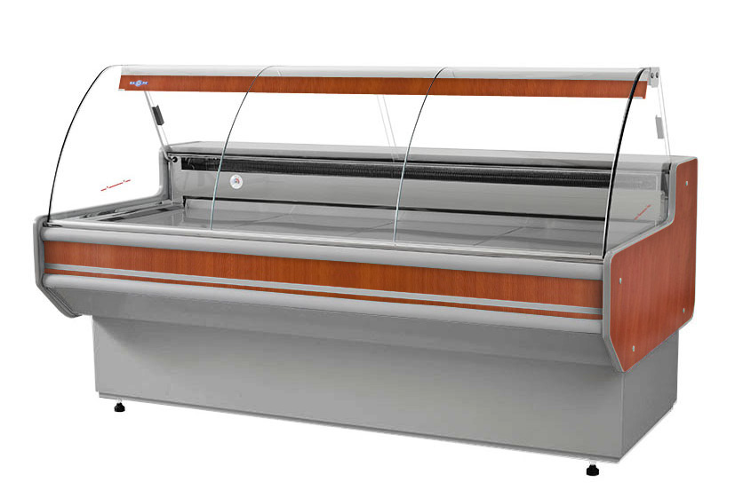 Lada chłodnicza z hartowaną i dzieloną giętą szybą, bokami z tworzywa PS-HIPS, wnętrzem przechowalnika oraz blatem ze stali nierdzewnej, możliwość wykończenia płytą w kolorze drewna - korpus urządzenia szary