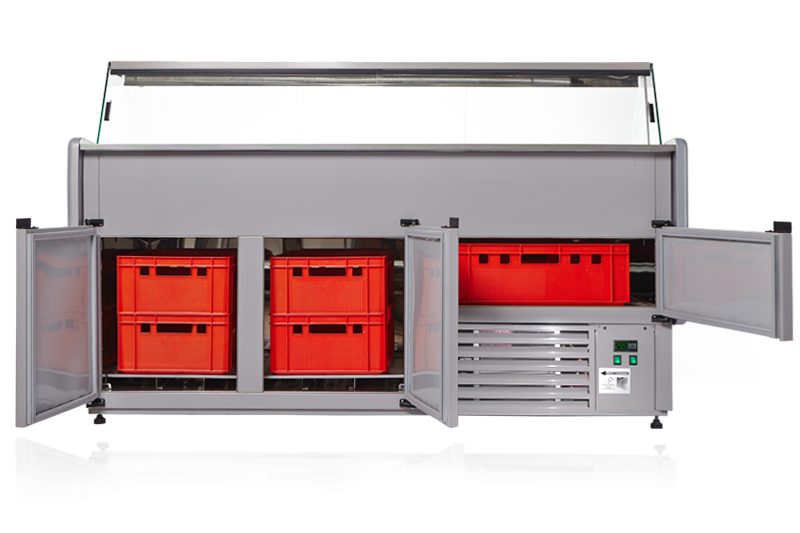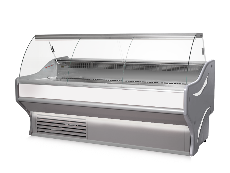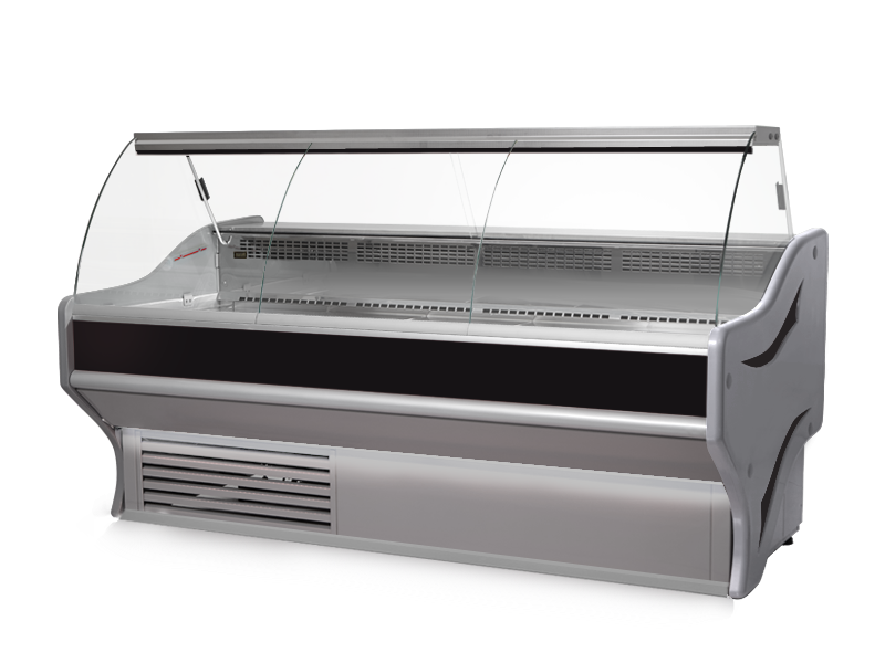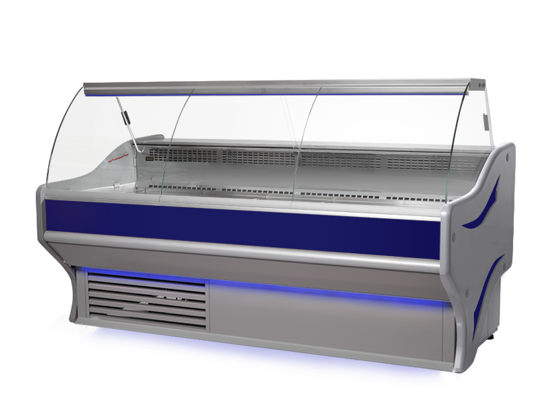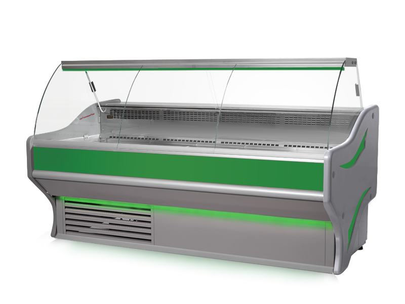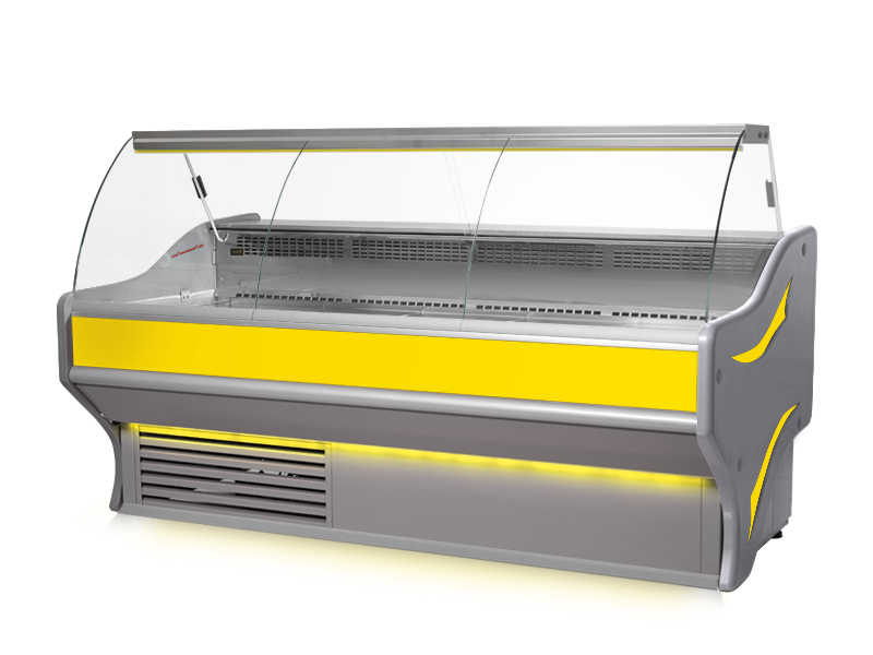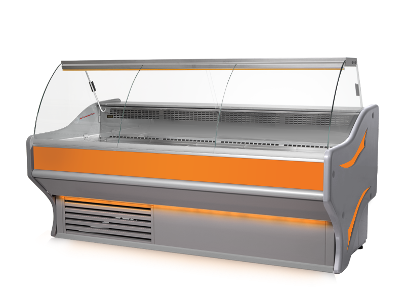 Lada chłodnicza z szybą giętą, ozdobnym i praktycznym nierdzewnym blatem, bokami z PS-HIPS wypełnionymi pianką poliuretanową, osłoną stopek, podświetleniem LED oraz korpusem w kolorze z wzornika RAPA.