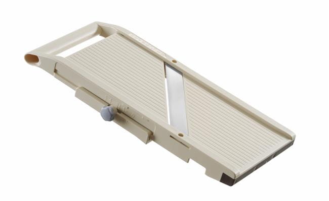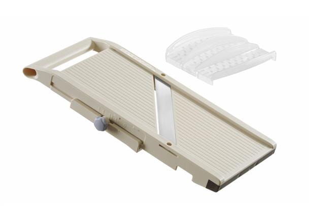Mandolina japońska HENDI Shogun ?? PRO to produkt jakości premium produkowany w Japonii. Jakość cięcia jest porównywalna do profesjonalnych noży, ale dzięki mandolinie plastry czy dekoracje z warzyw są zawsze tak samo perfekcyjne, precyzyjnie równe i uzyskiwane o wiele szybciej. Mandolina ma w zestawie jedno wbudowane płaskie ostrze – grubość cięcia jest łatwo i płynnie regulowana za pomocą pokrętła. Dzięki szerszej powierzchni roboczej, jest idealna do większych warzyw, takich jak cukinia, kapusta czy bakłażan.