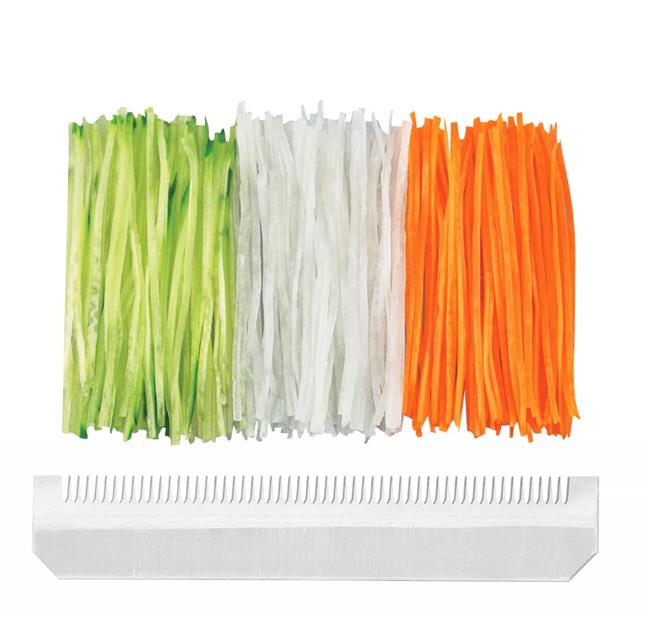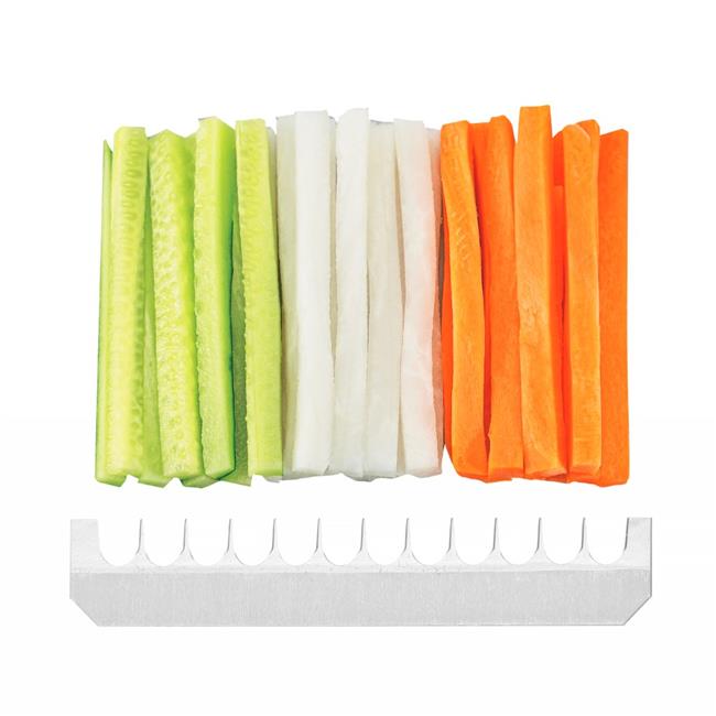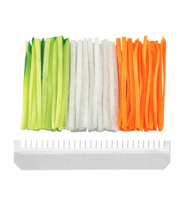 Ostrza wykonane z japońskiej stali nierdzewnej SUS 420J2. Obudowa wykonana z ABS. Płynna regulacja grubości cięcia: 1-5 mm. Wyposażone w: – płaskie, wbudowane ostrze tnące, które może ciąć na bardzo cienkie, prawie przezroczyste plastry, – osłonę na palce/holder wykonany z polipropylenu, służący do ochrony palców i przytrzymania warzyw/owoców podczas cięcia. Nie nadają się do mycia w zmywarce
