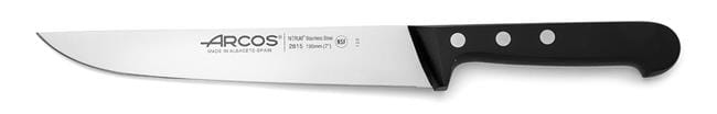 UNIVERSAL to seria solidnych, klasycznych, uniwersalnych noży do wielu zastosowań. Wyprodukowane w Hiszpanii. Ostrza wykonane z innowacyjnej, martenzytycznej stali nierdzewnej NITRUM® o podwyższonej twardości oraz odporności na korozję. Kute z jednego kawałka stali. Doskonale wyważone uchwyty wykonane z POM – bezpośrednio połączone z trzpieniem za pomocą nitów wykonanych ze stali nierdzewnej. Na uchwytach powłoka BACTIPROOF SILVER® pozwalającą zredukować do minimum gromadzenie się bakterii. Zwiększona odporność na wysoką temperaturę. Twardość: około 55HRC. Przystosowane do mycia w zmywarce, lecz rekomendowane jest mycie ręczne. Z certyfikatem NSF Nóż kuchenny, seria UNIVERSAL firmy Arcos jest wykonany z innowacyjnej, opatentowanej stali nierdzewnej, dzięki której zawdzięcza swoją wysoką twardość i odporność na korozję. Cechuje się również wysokim komfortem użytkowania – jego uchwyt jest doskonale wyważony. Sprawdzi się w szerokim wachlarzu kuchennych prac, od krojenia warzyw, po siekanie mięsa.