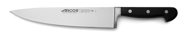 ÓPERA to seria solidnych, klasycznych, uniwersalnych noży do wielu zastosowań. Wyprodukowane w Hiszpanii. Lekko wygładzona powierzchnia przy krawędzi tnącej „silk edge” – cięcie jest jeszcze bardziej precyzyjne niż przy standardowych nożach. Ostrza wykonane z innowacyjnej, martenzytycznej stali nierdzewnej NITRUM® o podwyższonej twardości oraz odporności na korozję. Ostrza z zaokrąglonym grzbietem, kute z jednego kawałka stali. Doskonale wyważone uchwyty wykonane z POM – bezpośrednio połączone z trzpieniem za pomocą nitów wykonanych ze stali nierdzewnej. Twardość: około 55HRC. Nadają się do mycia w zmywarce. Z certyfikatem NSF Nóż szefa kuchni, seria ÓPERA firmy Arcos jest wykonany z innowacyjnej, opatentowanej stali nierdzewnej, której zawdzięcza swoją wysoką twardość i odporność na korozję. Cechuje się również wysokim komfortem użytkowania oraz zwiększoną precyzją cięcia – jego uchwyt jest doskonale wyważony, a powierzchnia przy krawędzi tnącej wygładzona. Sprawdzi się w szerokim wachlarzu kuchennych prac, od krojenia warzyw, po siekanie mięsa. Uchwyt oddzielony od ostrza profilowaniem chroniącym palce.