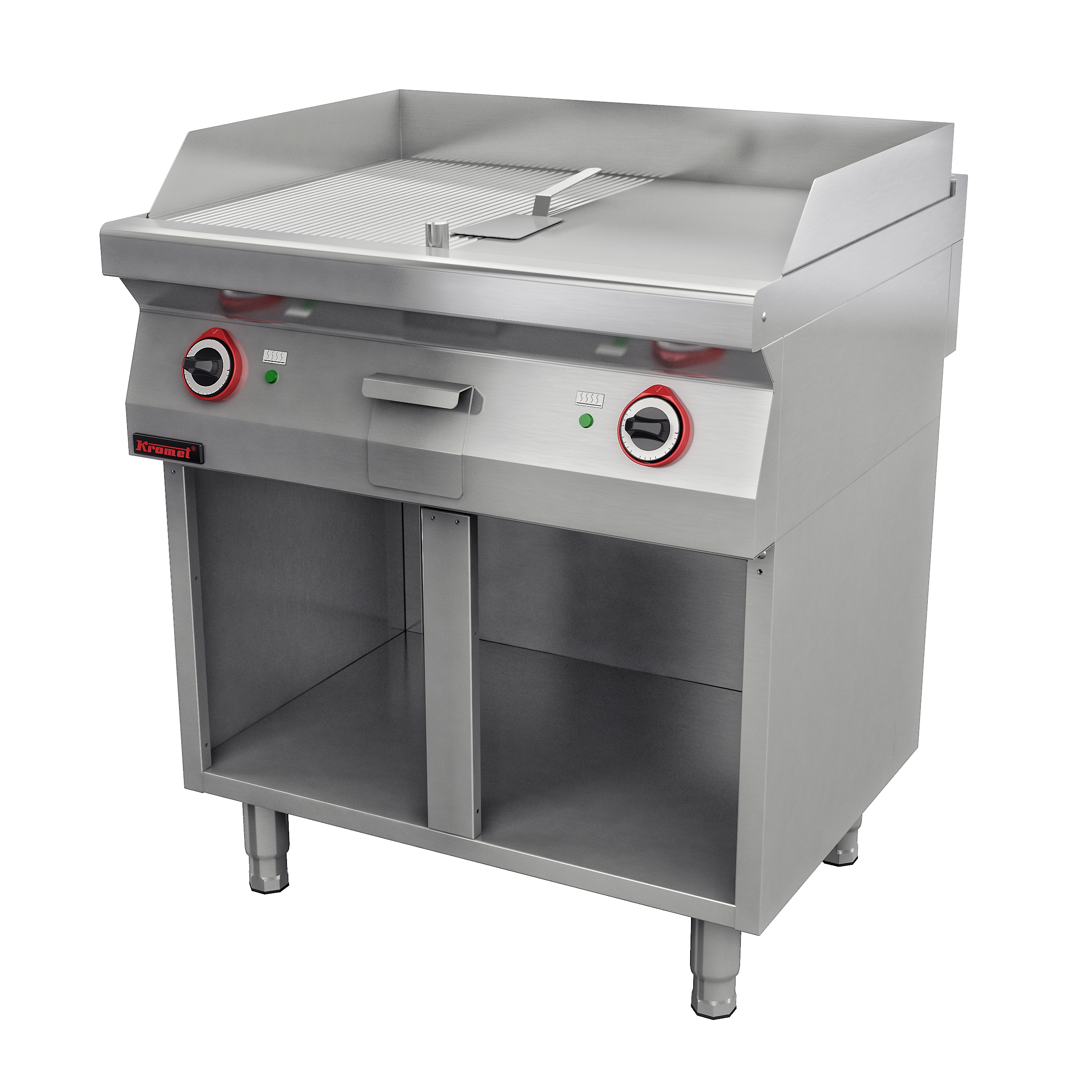 Płyta grillowa 1/2gł. + 1/2ryf. chromowana 800 mm 9,6kW na podstawie szafkowej otwartej