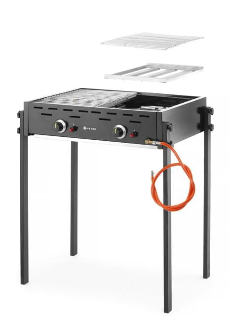 Dostępny w 2 wersjach: wolnostojąca lub nablatowa. 2 niezależne palniki gazowe z zapalnikiem piezoelektrycznym. 2 osłony palników wykonane ze stali nierdzewnej AISI 430. 2 ruszty ze stali chromowanej, o wymiarach 470x320 mm. Duża tacka ociekowa, pomaga również w utrzymaniu ciepła. Miedziane zawory z systemem automatycznego odłączania przepływu gazu – system uruchamia się po zgaszeniu płomienia. W zestawie wąż gazowy z reduktorem. Odpowiedni do użytku na gaz propan i butan