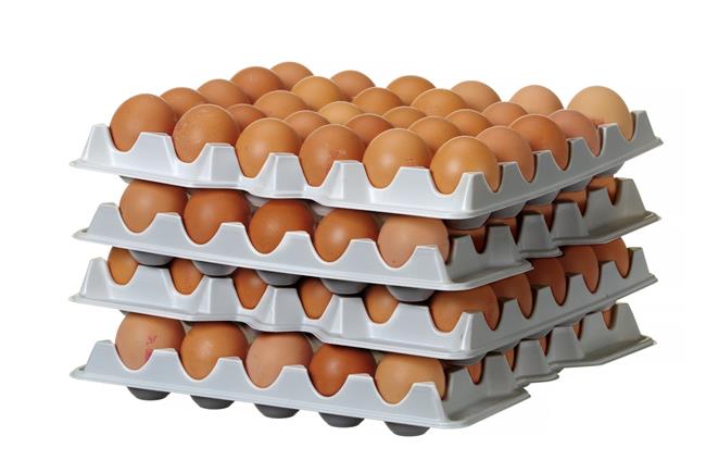 Każda tacka mieści 30 jajek (5 × 6 rzędów) – cały zestaw mieści razem 120 jajek.